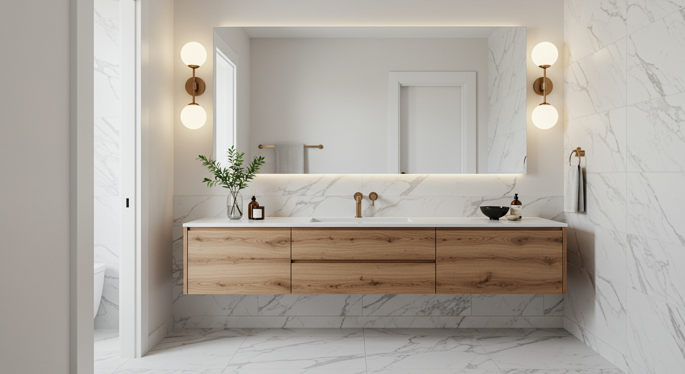 Sometimes the best bathroom remodel ideas are the simplest. For this Spanish-style home, the trick was rounding out a vanity corner here, adding marble trim there, and spotlighting the existing sauna with a see-through door.