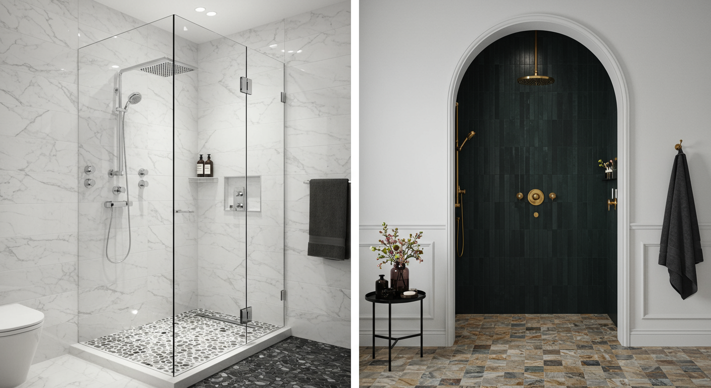 In her new Tudor home, Casey designed a cavelike shower swathed in dark green soldier-stacked tile with matching grout. She insisted on a curbless layout so the experience of walking inside the cocooning area is 100 percent seamless.