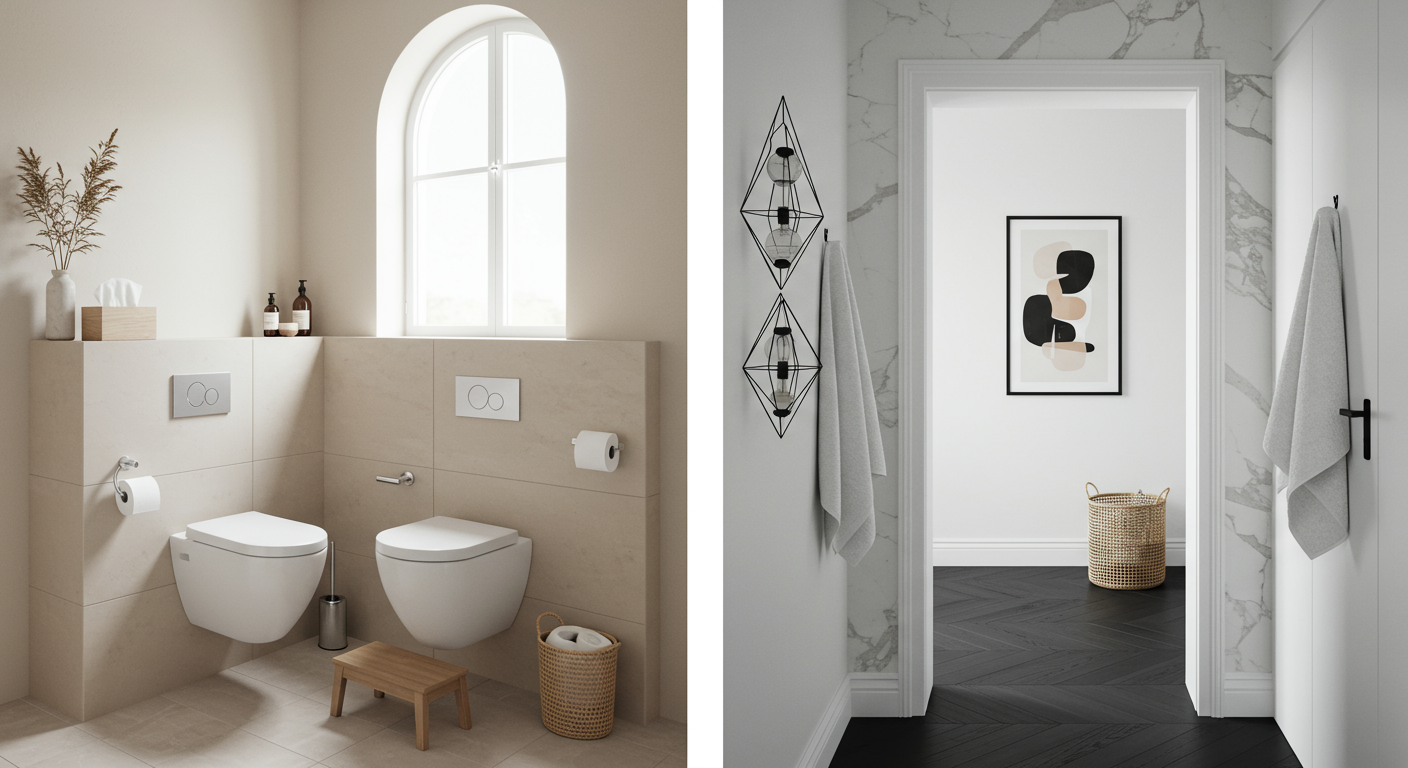 The toilet used to be the focal point of this New Jersey bathroom, but now it’s tucked away in a proper water closet with a pocket door that’s framed with wide slabs of Calacatta Fantastico marble.