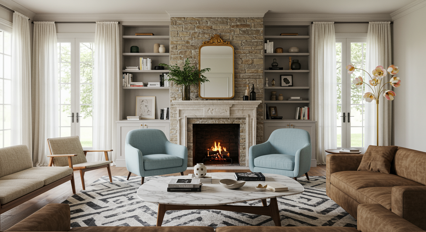 The living room is a prime example of what it looks like when texture reigns supreme. It’s a who’s who of pieces designed by Sarah—past, present, and forthcoming (such as the daybed and fireplace screen)—that are flush with undulating curves and soft textures like velvet and bouclé to draw you into the room. “We wanted to mix lots of texture and subtle patterns to make it feel just as rich and layered as the house itself,” she emphasizes.