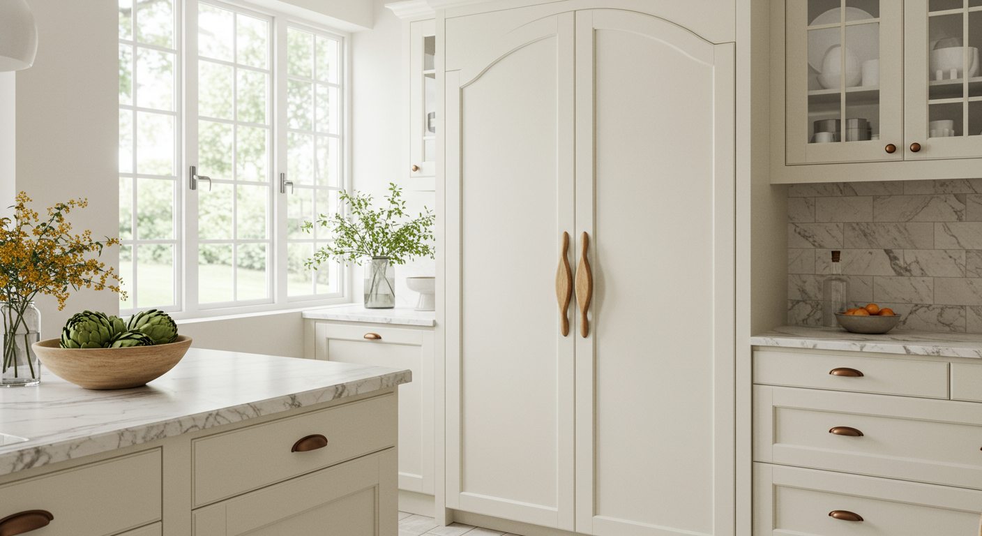 This is the year of the butter yellow kitchen, after all, so why not go all in? Sarah says the creamy color seen here was just the right hue to play off the cabinets, the subtle undertones in the marble, and the floor tiles that were all brought in after the kitchen was fully gutted. Rather than a cookie-cutter grid of matching millwork, the kitchen also layers in varied hardware and cabinetry, including a custom design made by Sarah’s dad to conceal the refrigerator. It’s accented with wood pulls and finished with a curved frame that mimics the arched doorways in the home. “We installed my soon-to-be-released DIY version of modern beaded cabinets by Semihandmade and mixed three different cabinet door styles to create the sense of more storied character in the brand-new kitchen,” Sarah notes.