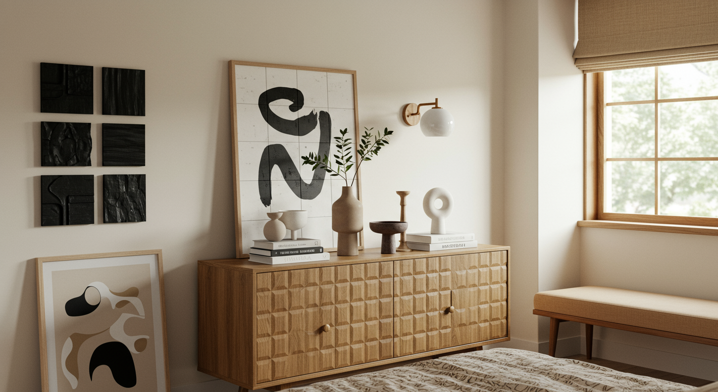 If you prefer to keep your bedroom quiet on the color and design front, play up tension elsewhere through your decor choices. Here, warm woods and textures set the scene for serene coziness, while modern art and tactile sculptures keep the room from feeling too snooze-worthy. “I’ll always tread that line of contemporary and classic, where there’s a little tension between the two,” Sarah says.