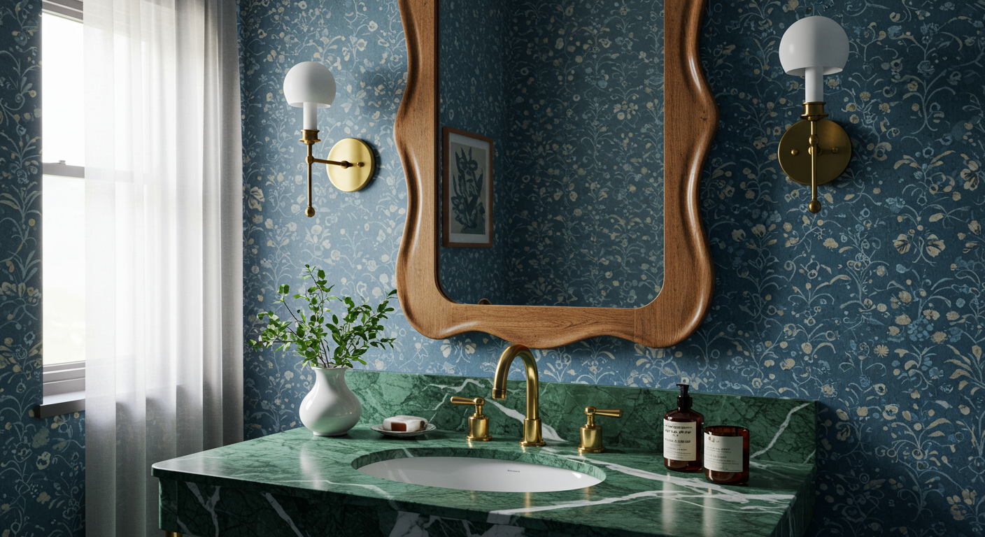 The powder room is an ideal contained space to let your freak flag fly, specifically when it comes to mixing materials and finishes. Sarah opted for layered patterns with a mosaic tile, a grass cloth wallpaper from her own collection, along with a striped sink skirt and green marble that dialogue with each other while you wash your hands. “I like the idea of having some kind of color blocking, not just a matching or a white marble,” she explains of the decision to go with an unusual green hue. The lacquered brass on the faucet is a material that she also says ages well over time.