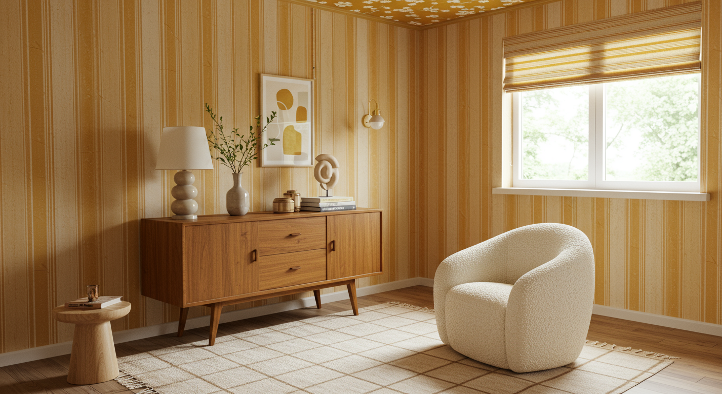 Not one to shy away from a romantic print or color scheme, Sarah mixed and matched two playful wallpaper prints on the walls and ceiling to envelop this bedroom in cheerful patterns, then doubled down with matching window treatments and yellow trim. “I wanted to go for layers on layers and pattern on pattern, which I think is fun and also indicative of a Tudor, but doing it in more modern versions of something you’d see back in the day,” she says. Even the vent cover is painted yellow so the eye can rest instead on the soothing neutrals of the armchair and rug after roving the room.