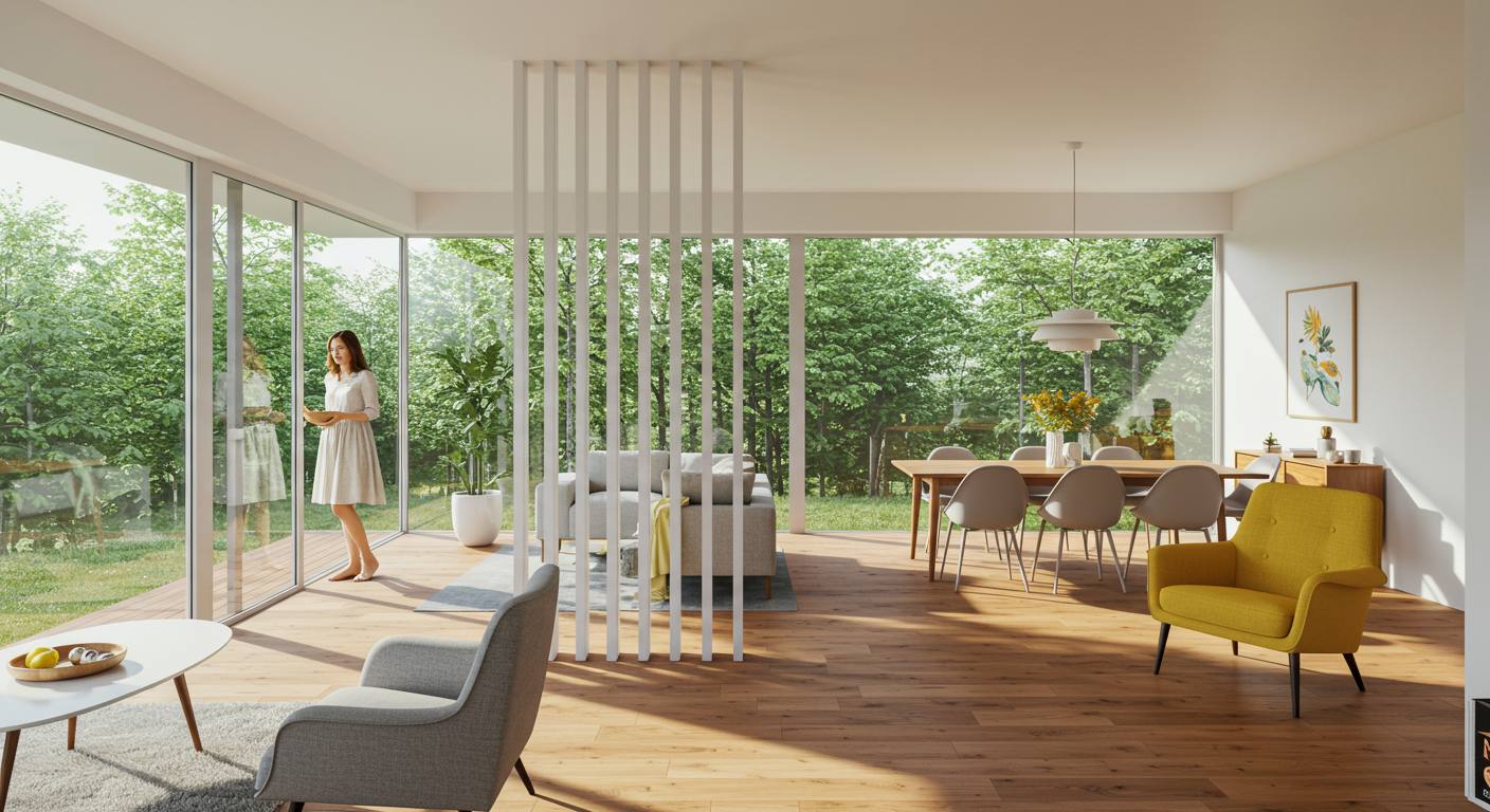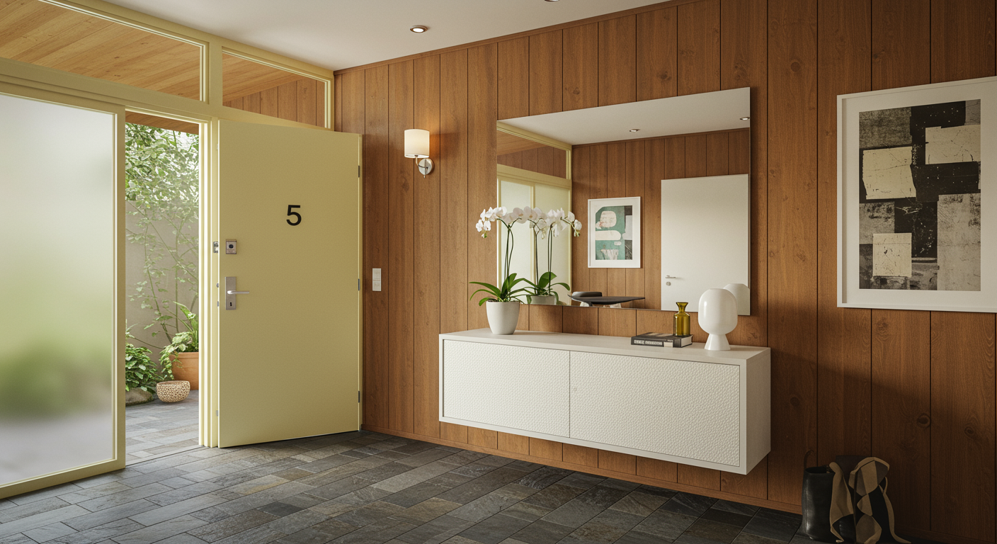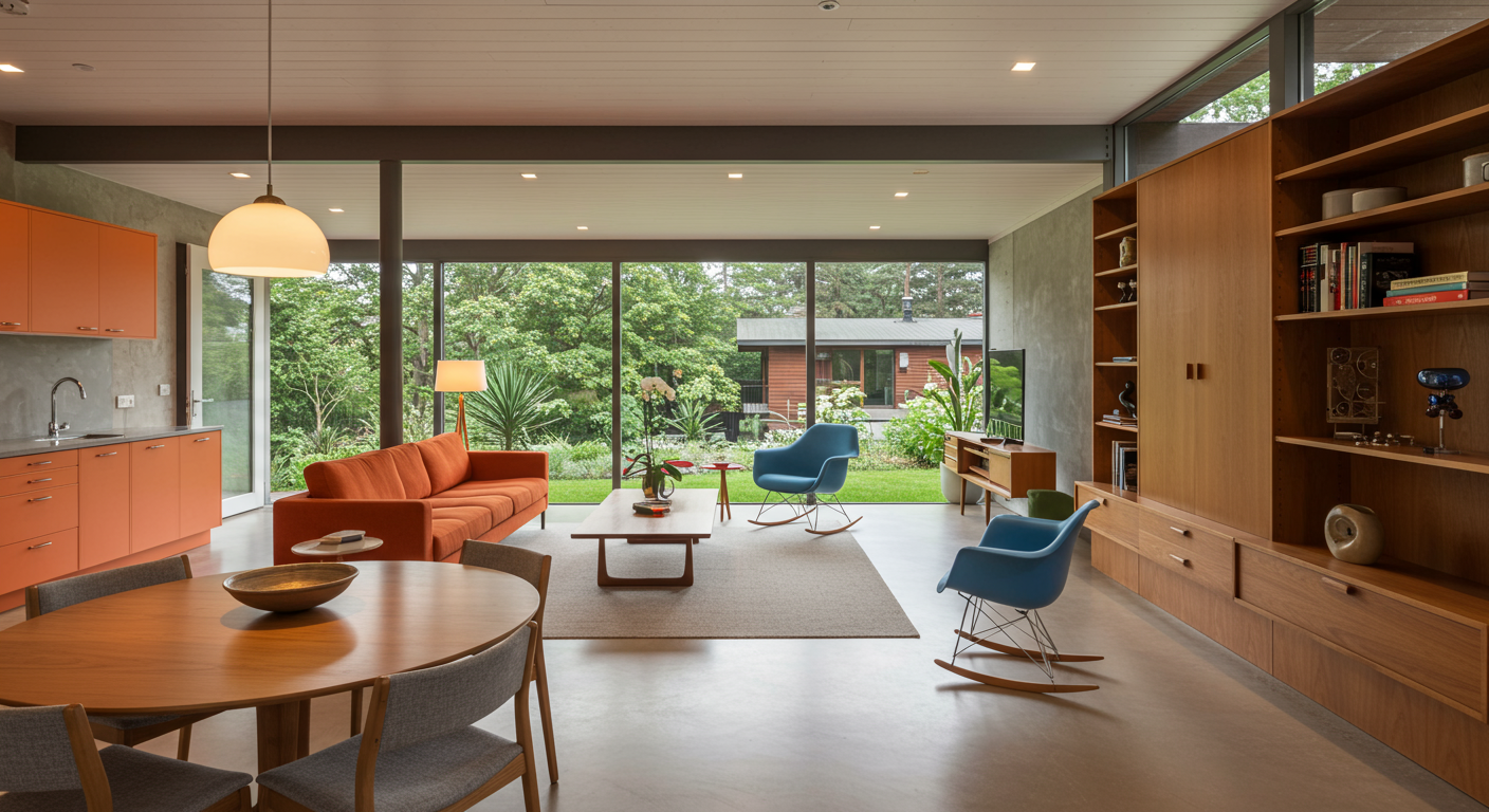 The clean white surfaces that dominate much of the home’s interior contribute to a modern minimalist aesthetic, which complements the mid-century modern design without overshadowing it.