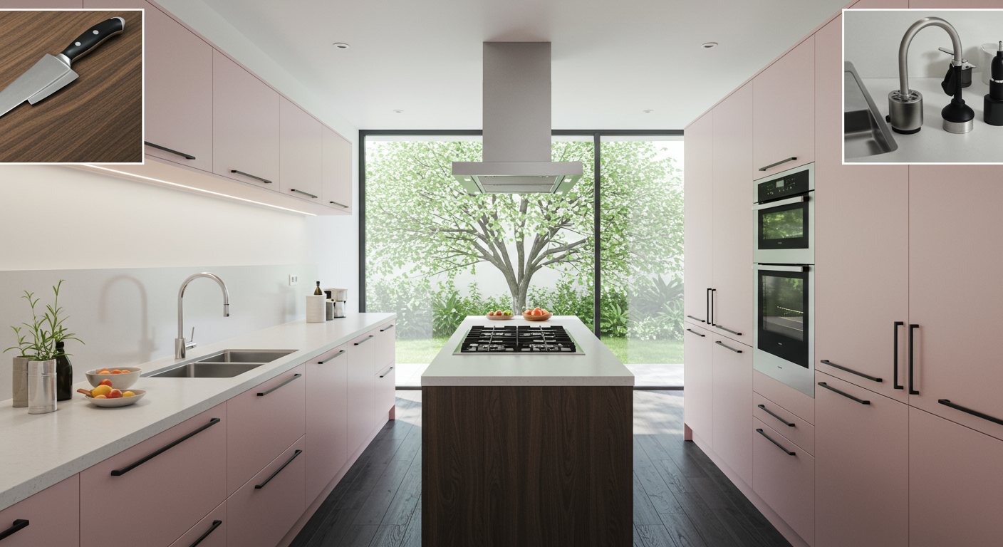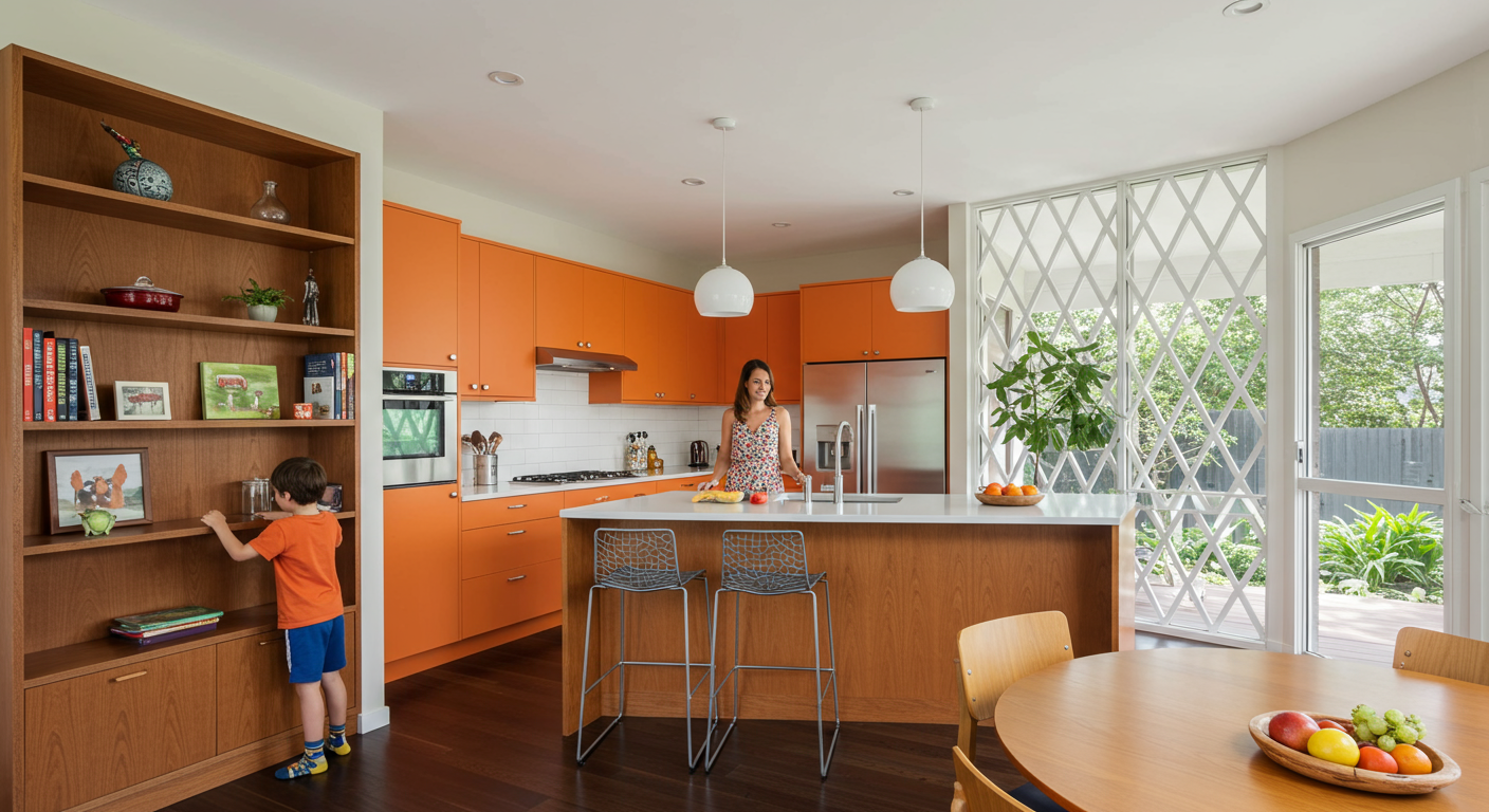 SMA collaborated closely with Henrybuilt to create a contemporary kitchen that pays homage to its mid-century roots, featuring papaya-colored laminates, walnut paneling, and custom pulls.