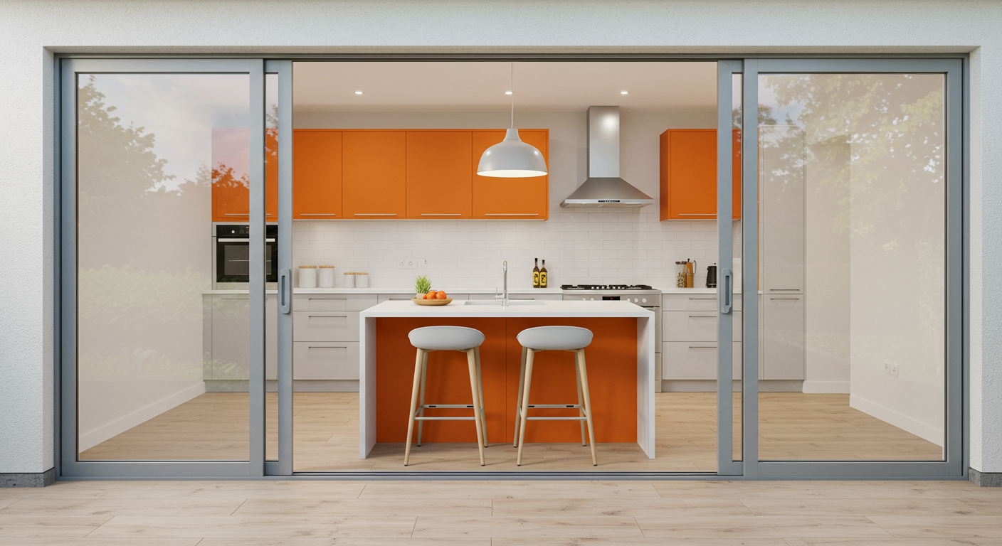 The orange in the kitchen disrupts the muted quality of the overall palette, which otherwise comprises dark brown and white, creating a striking yet harmonious balance.