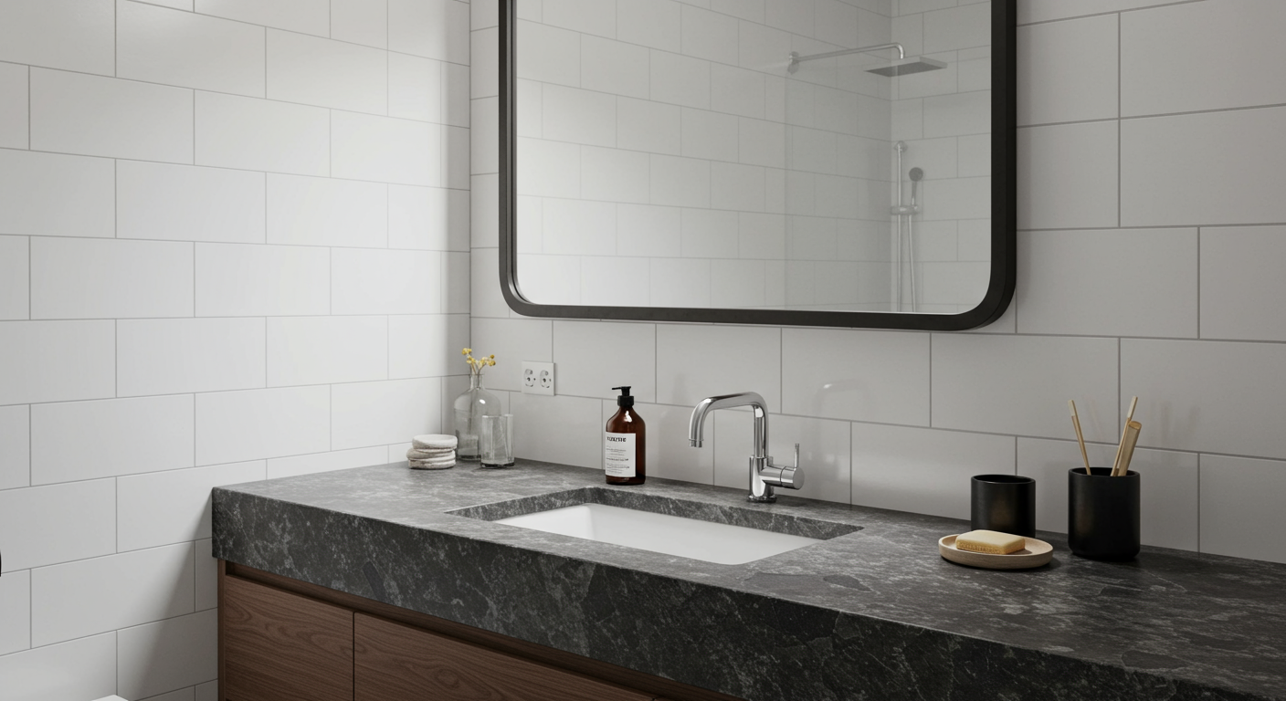 Another idea is to use a bold stone countertop with a simple subway tile. “This classic look is inexpensive and looks good in any bathroom,” says Patton.