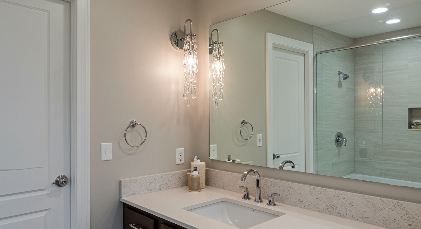 In another lighting example, Peltier switched out the dated light fixture to add more depth and interest to this bathroom.