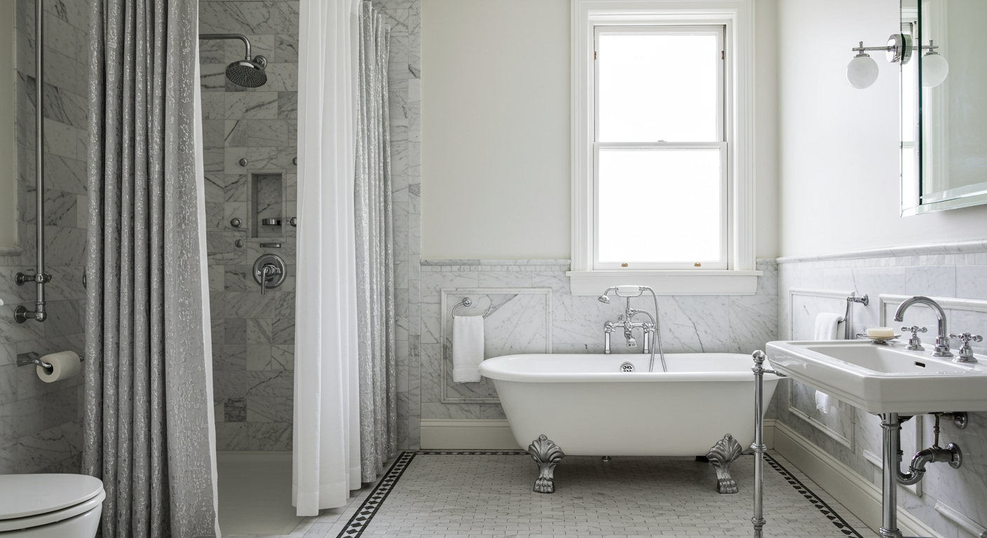 We’re starting this list with before and after photos of a primary bathroom in the 1897 home of designer Bethany Adams, owner of Bethany Adams Interiors in Louisville, Kentucky. “The bathroom had been poorly updated through the years but was otherwise in its excellent condition, still boasting the original tile floors, marble wainscoting, and cast-iron clawfoot tub,” Adams tells us. She swapped out the light and plumbing fixtures for more modern chrome and Lucite versions from Pottery Barn and Delta, which completely changed the look of the space. “Rather than use typical shower curtains, we used a waterproof liner with silver-and-white drapery panels from West Elm for a more luxe look.”