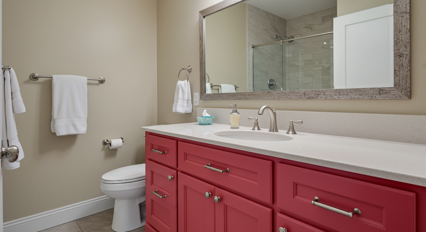 A vanity can make your bathroom look new; however, replacing it can be expensive. If you want to make more of a statement, try painting it a fun pop of color, which will provide a personality boost to the bathroom.