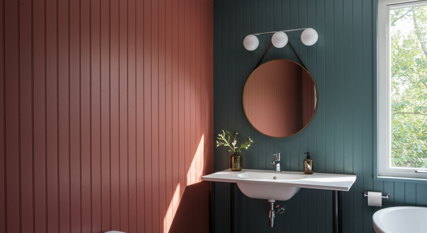 There are also easy and inexpensive ways to add some architectural features to your bathroom. In this design, Sherman used shiplap millwork painted a bright contrast color to add interest in the bathroom.