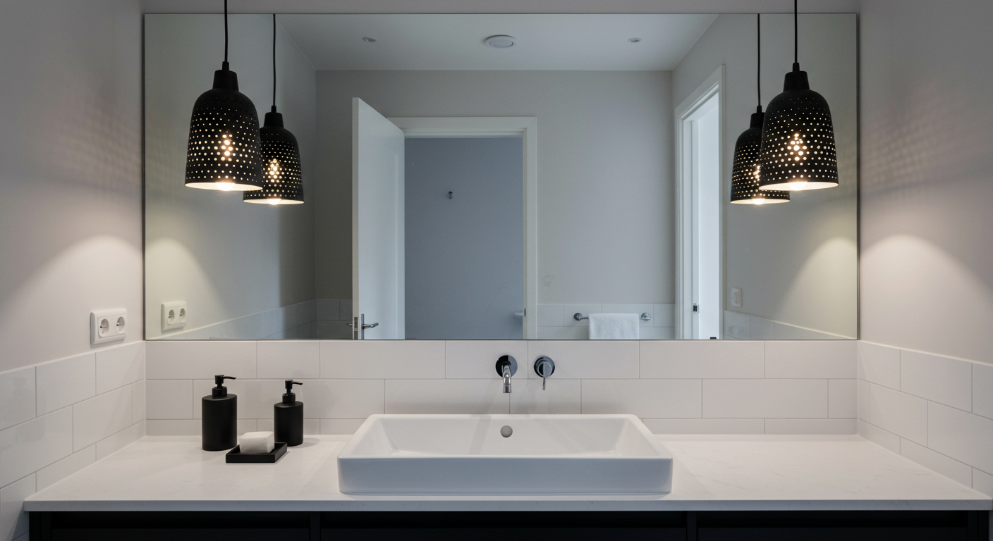 In this photo, Hersch has designed an otherwise simple black-and-white bathroom, but the hanging perforated metal sconces add a wow effect without the heavy lifting of a full bathroom reno.
