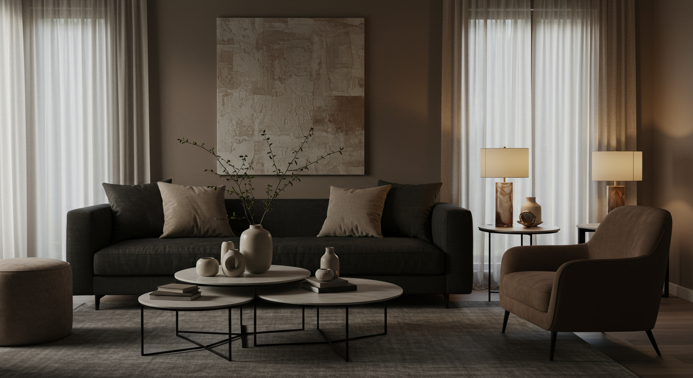 The family room, with a custom Grant Trick sectional, provides a relaxing in-home escape. A set of two tables with Pierre de Lens Stone and a tropical hardwood base are by Benoit Viaene and a collection of contemporary ceramics layers in additional texture. A set of Regent lounge chairs, designed by Marco Zanuso for Arflex Italy, dates to 1960. Curtains—made from flax linen handwoven by Sam Kasten and fabricated by J.Edlin Interiors—appear throughout the house.