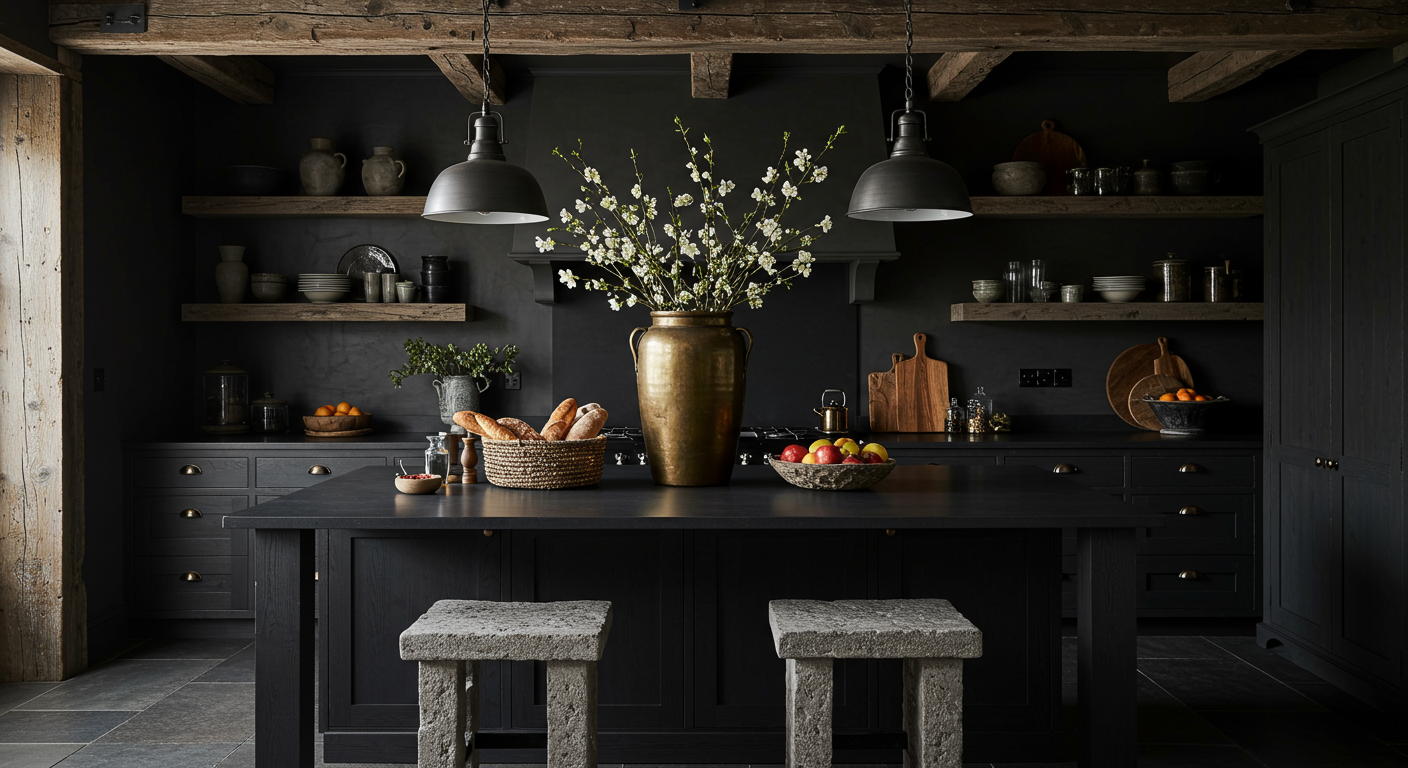 According to Gibson, the client found her after searching for pictures of black kitchens online and clicking on a link to an AD story featuring the designer’s home. “What was great about this client is that she knew herself,” Gibson says. “She knew that dark spaces were very comforting to her. One of the first things she said she wanted was a black kitchen.” To keep the room from feeling too severe, Gibson layered materials, starting with darkened, tumbled, and antiqued Belgian Blue Stone tiles for the floor. From there, she built up, using a striking custom steel island (crafted locally), burnt-oak cabinets (also made locally), and black Absolute Zimbabwe stone countertops. “One of the ways to create depth and interest within a limited palette is through textures,” Gibson explains. A set of handmade bar stools by Ayala Israel and collected ceramics displayed on open shelving help break up the monochrome scheme.