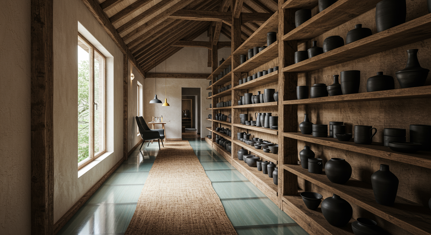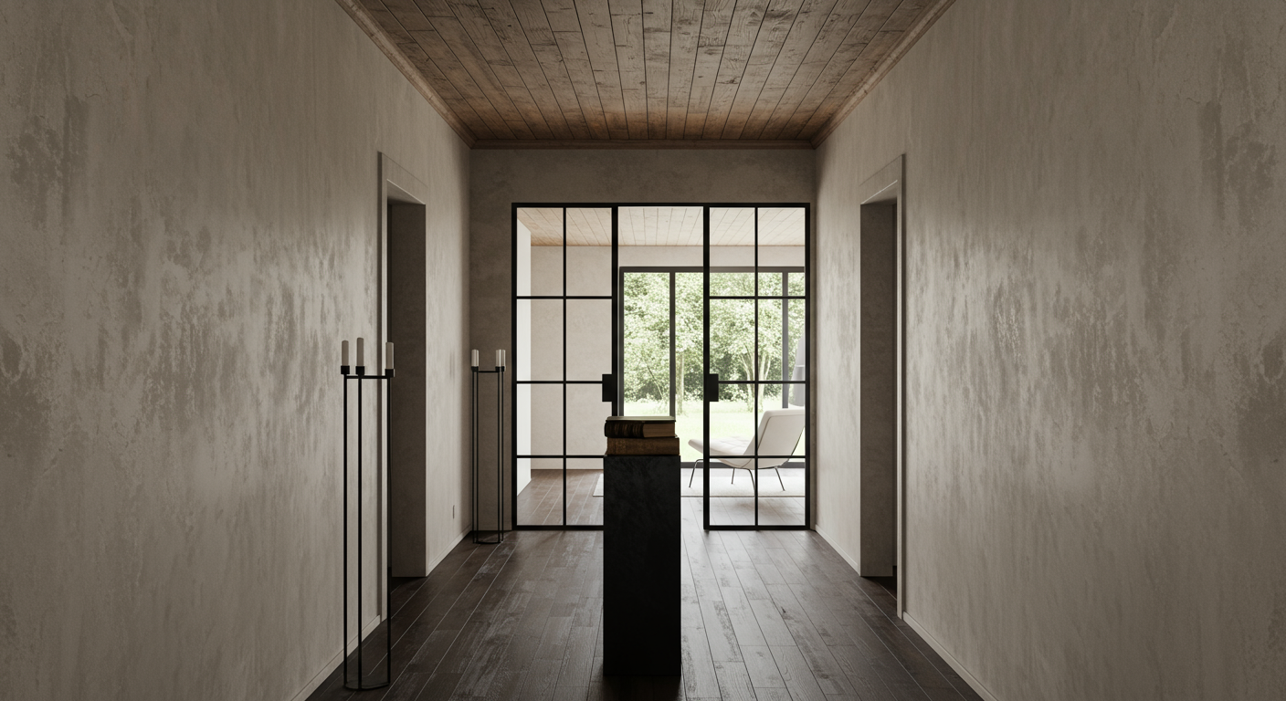 The upstairs hallway is minimal, with a sculpture by Yongjin Han, purchased through Maison Gerard, and a set of iron candlesticks found at Balsamo Antiques in New York. A Pragh Chair and ottoman by Madsen and Schubell peek out of the room at the end of the hall.