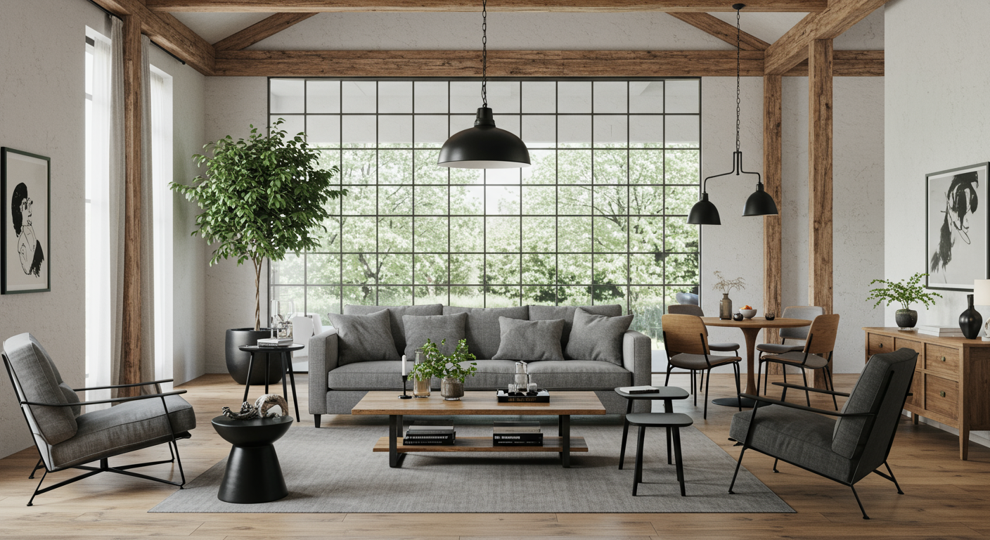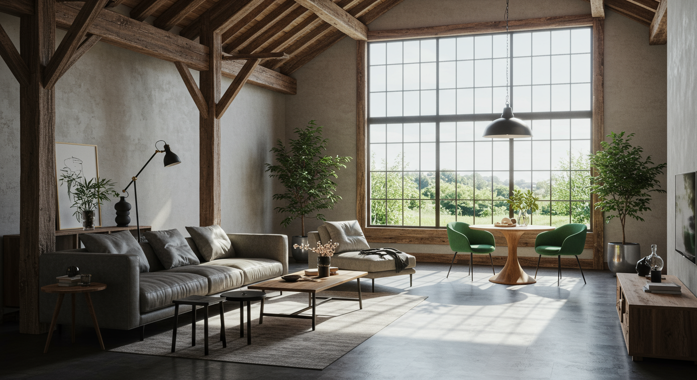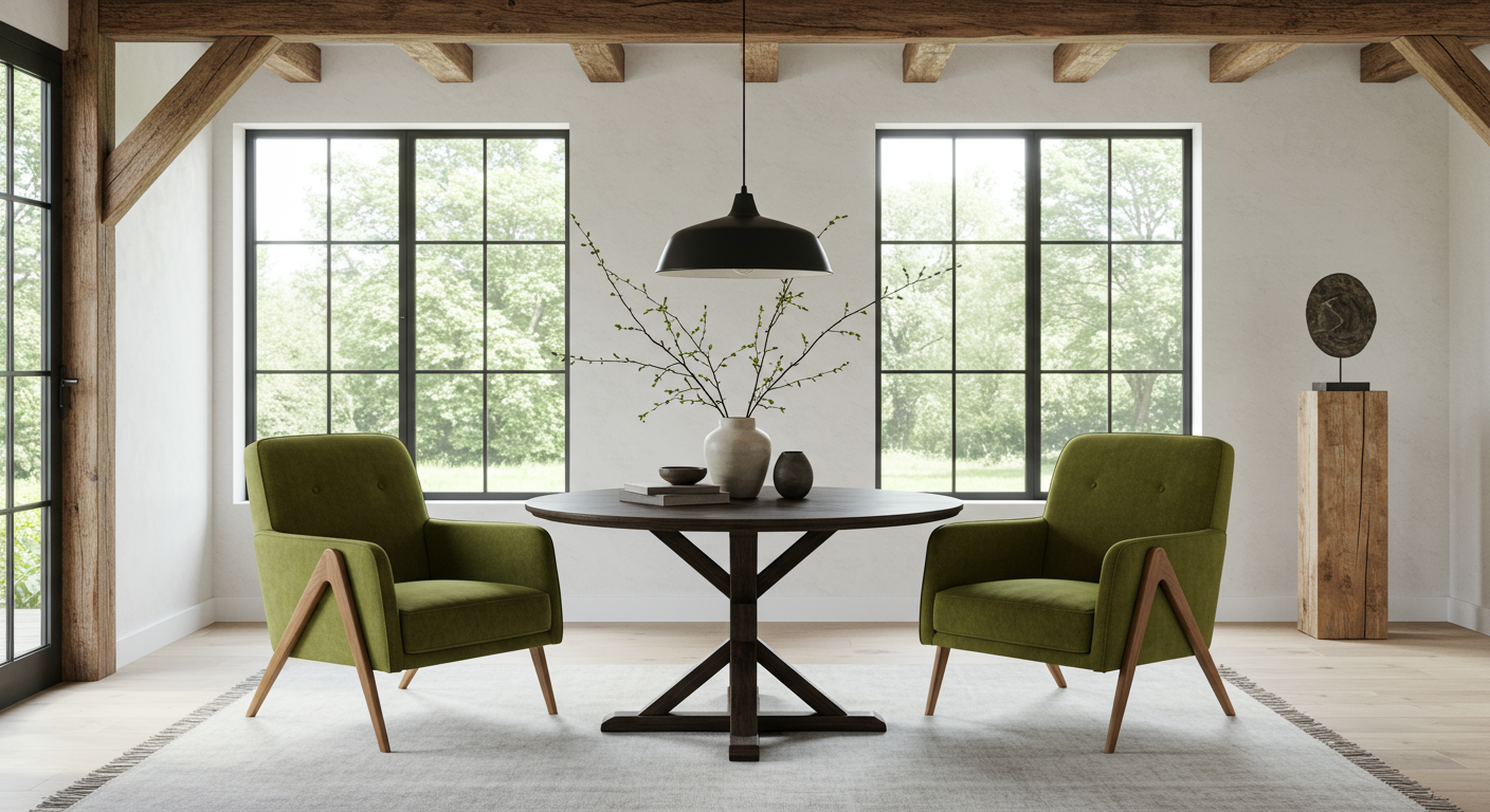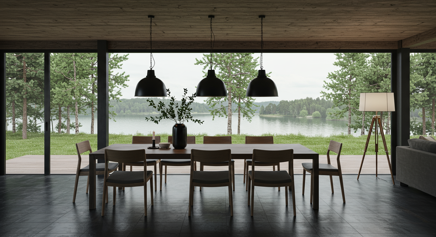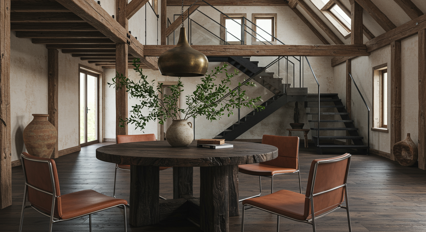 In the dining area of this Pound Ridge Home, warm wood—the reclaimed boards used for the ceiling, the set of vintage Axel Einar Hjorth dining chairs, purchased through Hostler Burrows, and a Copiaco Table Lamp by Stephen Downes—help balance the dark palette, anchored by Belgian Blue Stone floor tiles. The Atomic Lamp by Atelier Van Lieshout adds an industrial twist to the dining table.