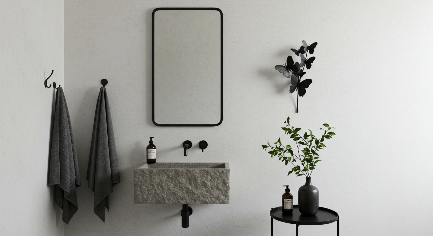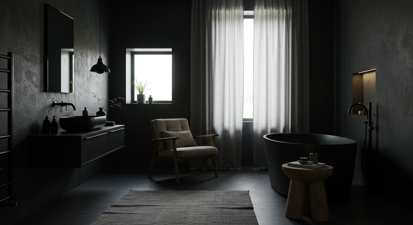 Like the kitchen, the primary bathroom is mainly black, except for the leathered Avocatus stone wall behind the vanity. An antique kilim runner from Doris Leslie Blau picks up the green tones in the wall stone, and a wood chair by Francis Jourdain pairs with a Charlotte Perriand stool to break up the dark scheme. Gibson used the same black plaster in this room as in the kitchen.