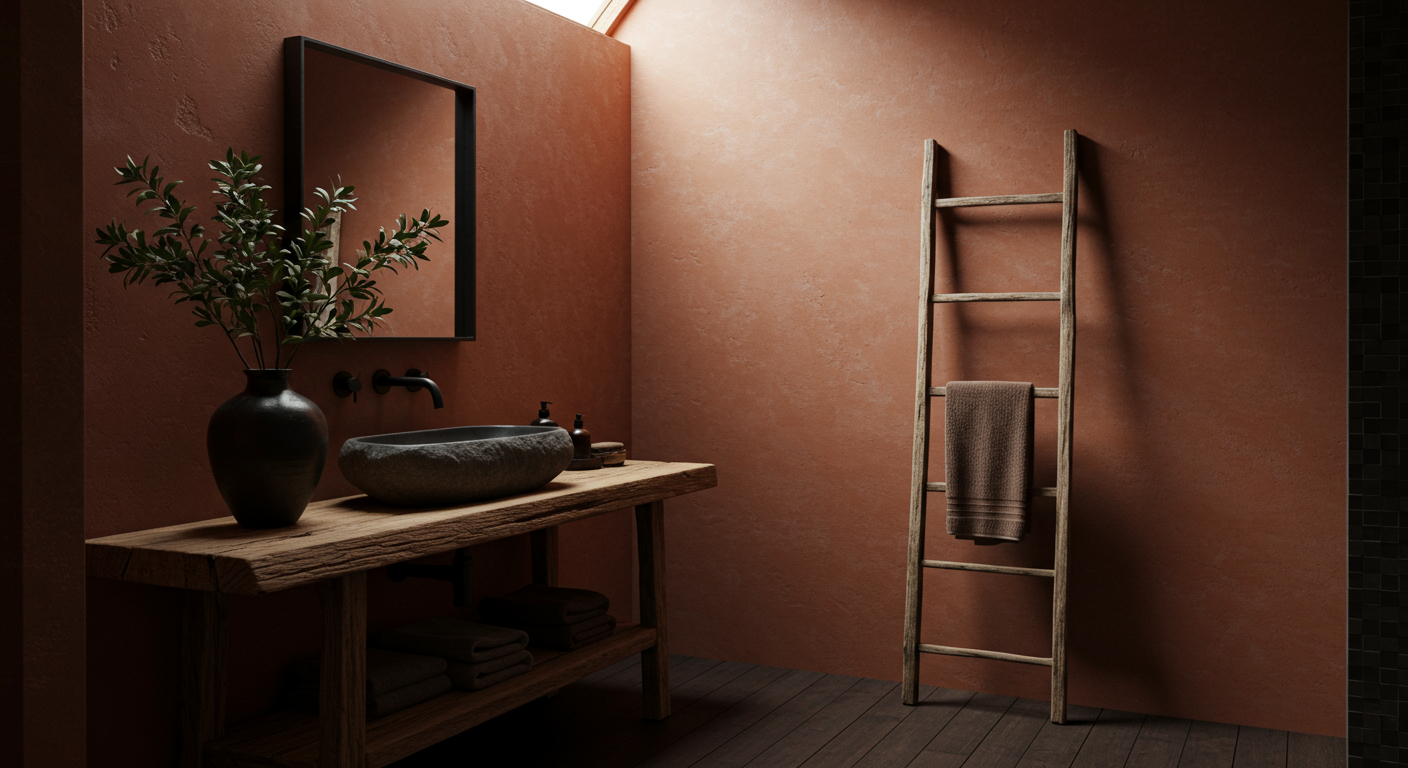 Gibson notes that, in addition to her client’s request for dark rooms, she wanted to include moments of terra-cotta in the house, so the designer used the shade to plaster the walls in a powder room. The vintage ceramic mirror is a Marcel Asselbur original.