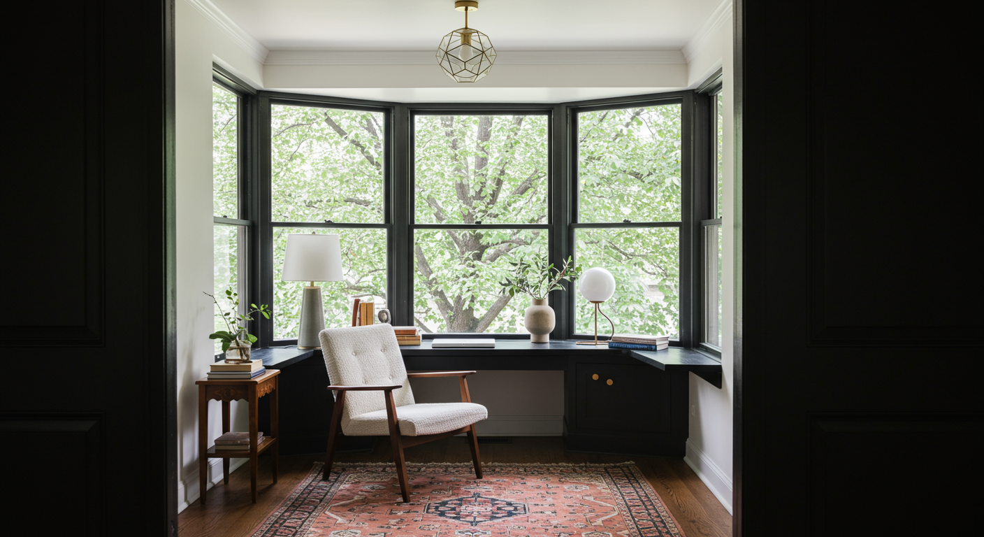 In the client’s office, a custom Ferro Lantern by Cox London brings a brutalist flair to an otherwise subdued aesthetic. A vintage Chinese silk rug and 18th-century Portuguese side table play nice with a contemporary Holly Hunt Tee Back armchair.