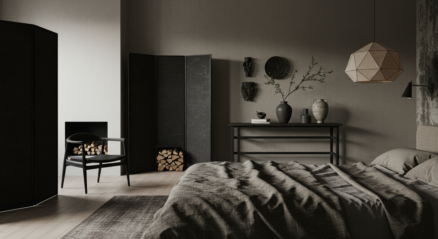A custom shou sugi ban headboard by Gustavo Neves crowns the bed in the primary suite. The room includes layers of linen, a cashmere-and-mohair Cloud Nine rug from Beauvais Carpets, and a vintage Teli Pendant by Achille and Pier Giacomo Castiglioni for Flos. A custom set of Iron Fire Tools by Iron Meagan Metalworks hangs next to the hearth.
