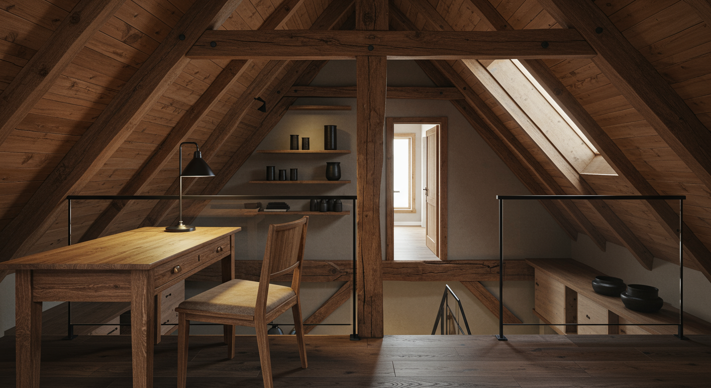 Taking pride of place on the mezzanine—the client’s husband suggested its inclusion after construction had already begun— is a library table with integrated metal light, designed by Pierre Jeanneret in 1963. The teak-and-leather chair, also by Jeanneret, dates to 1961