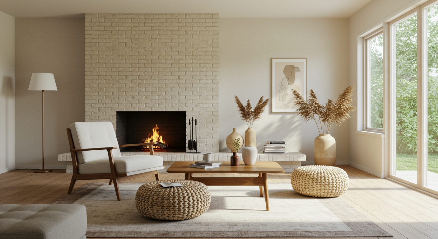 We also put in new windows, Fleetwood sliders, and gorgeous geometric interior oak doors and removed the drywall that once covered the beautiful brick fireplace, which we were able to restore.