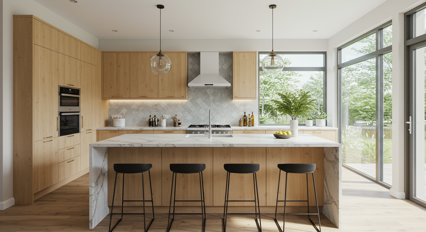 Prior to this, the home had popcorn ceilings, closed-off rooms, damaged floors, and carpeting in the primary suite, and was dark, dated, and had been neglected for years. The design team added durable materials to the home by incorporating custom oak cabinetry in the kitchen, engineered wood flooring, and interior doors which were constructed in oak wood and feature a beautiful geometric design.