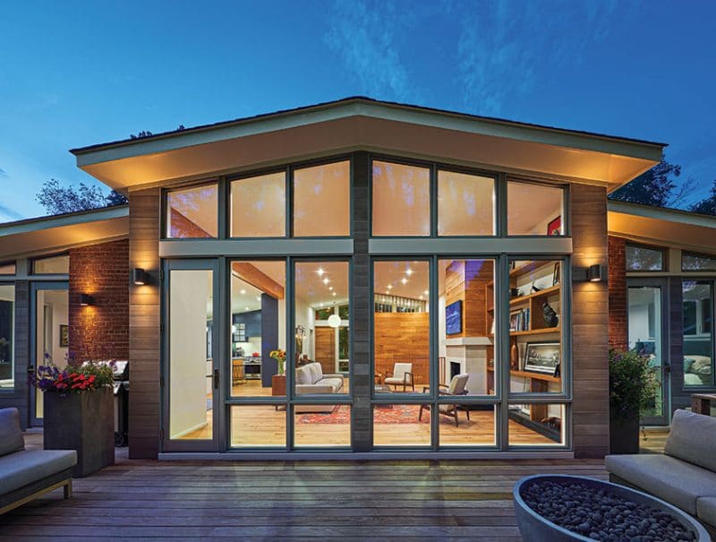 The addition at the back of the home comprises an expansive wall of windows that connects the interior to the exterior, providing beautiful views of the surrounding landscape. The new deck is made of ipé hardwood and extends the living area outdoors.