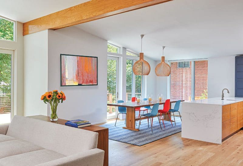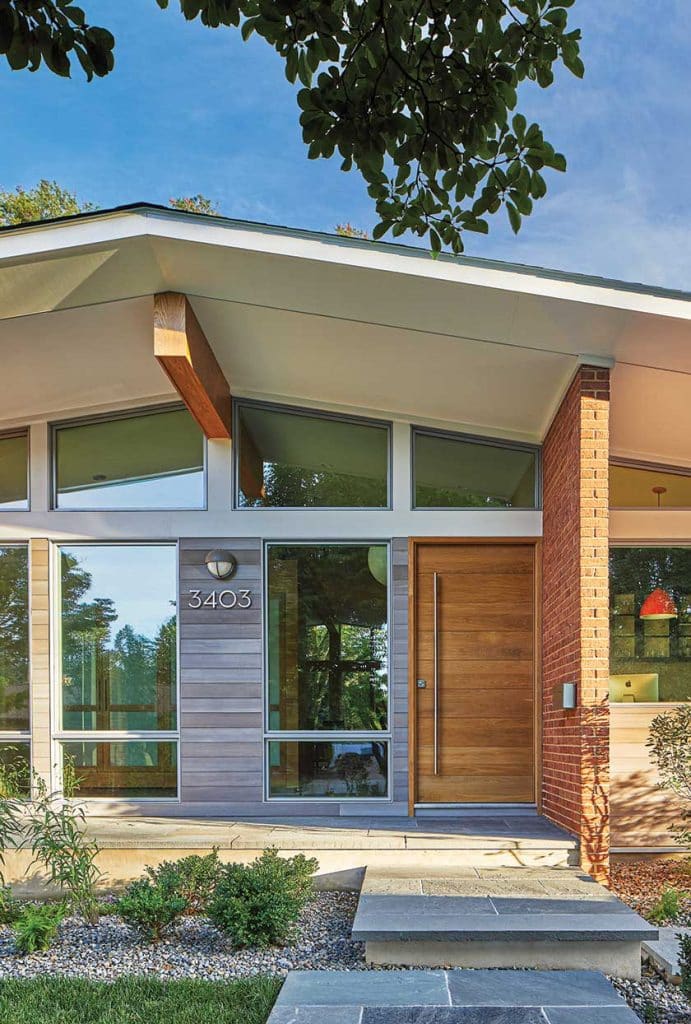 Preserving the original brick on the exterior was a priority, so architect Charles Warren added white cedar siding to break it up and add a more modern feel. “We picked it to complement the existing brick color,” he points out. The vertical brick walls are original, but the middle of the home was updated to accommodate an entryway, which leveled out the exterior when the entrance was originally farther back. New landscaping and a new front door elevate the home’s curb appeal.