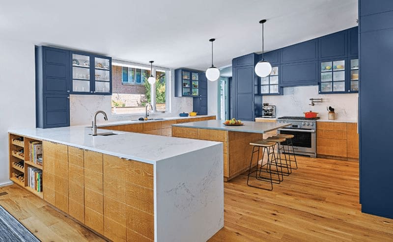 Expanding the kitchen and ridding it of its 1980s makeover was a key part of the home’s renovation. With white oak flooring, red oak cabinets and Caesarstone quartz countertops, a mid-century feel was brought back to the space. Custom blue cabinets up to the ceiling were built to eliminate the need for dusting and also accentuate the architectural structure of the original slanted roof.