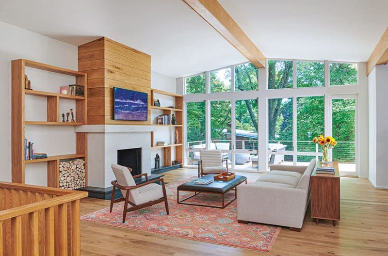 The window wall and glass door also open up the interior to the back deck and connect it to the surrounding scenery. These additions increased the livable space on the main floor, giving the homeowners room on the level below to have a family room, wood shop, gym, and guest bedrooms.