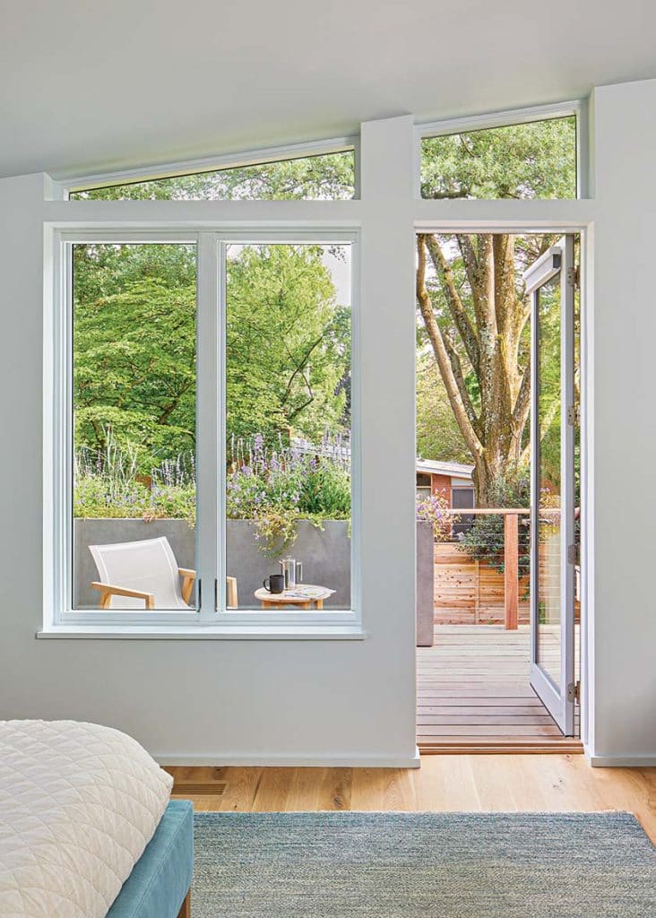 Charles maintained the original features of the home wherever he could, and this part of the primary bedroom suite is one such example. “We made one of the windows into a door that leads to a private deck. other than that, the window configuration is original,” he says.
