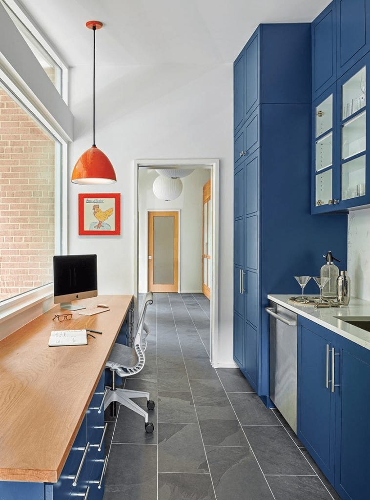 Most of the home follows a neutral color palette, but the kitchen, office and primary bathroom have deep-blue features that play to one of the homeowner’s preferences. “The client loves blue, so we wanted to incorporate it where we could,” Charles says.