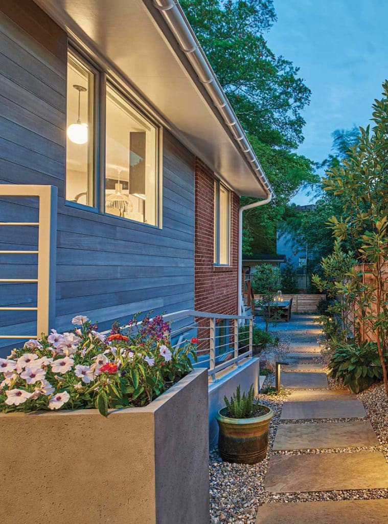 The garden on the side of the house has bluestone pavers and fiberglass planters to create a nature-inspired path to the back of the home.