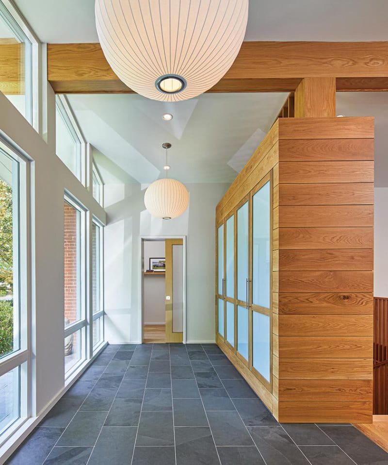 The foyer is a new addition that connects the two wings of the home and features a freestanding cabinet with frosted glass. “it’s a big coat closet that acts as a screen so that you can’t see all the way through the house,” Charles explains. The structural beam is a new piece of steel covered in wood. “we extended it, but it’s in the same place as the original beam.”