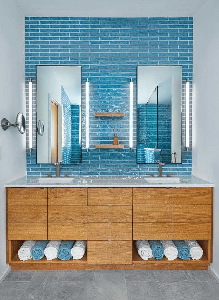 Blue tile with a glass-like finish gives the Primary bathroom a calming atmosphere. Although this space was completely redone, it maintained its mid-century feel via the custom white oak vanity, modern lighting and clean lines.
