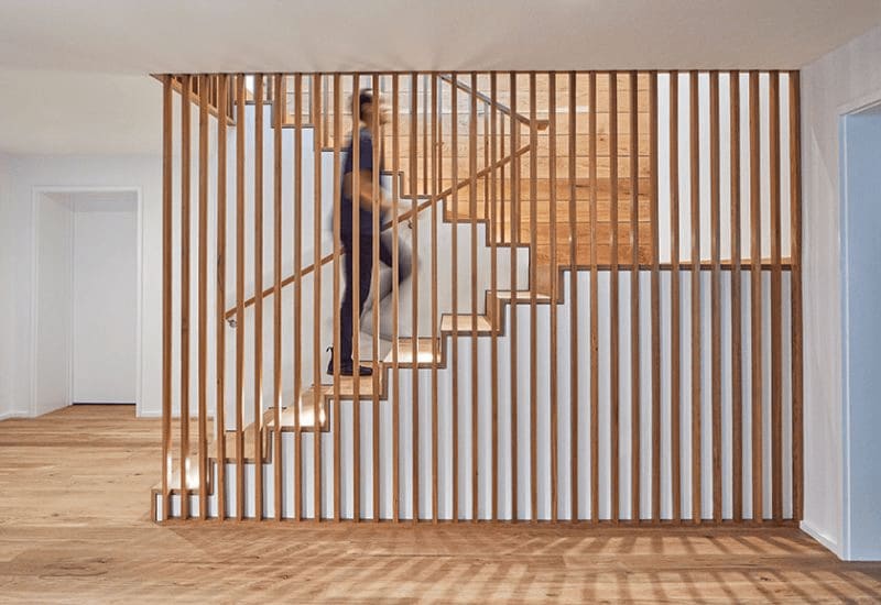 The staircase transformed from just a means of transportation into a sculptural piece. The stairs were originally enclosed by walls on either side, so Charles knocked down one wall to open up the space. “Screens helped divide spaces in mid-century work,” he says. “We spaced the vertical wood slats so they would perfectly meet the railing on the main floor.”