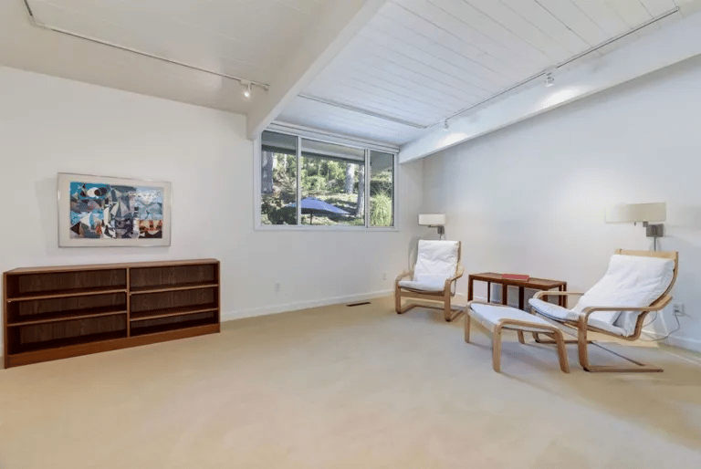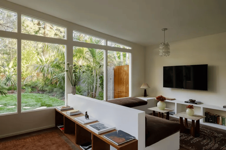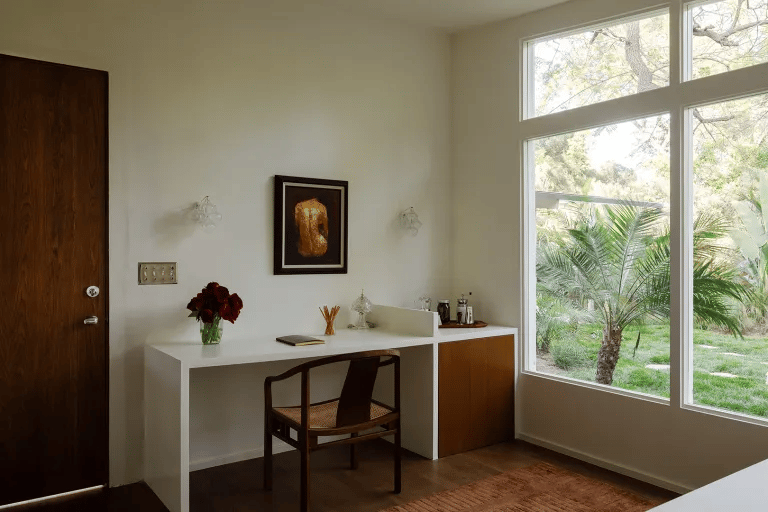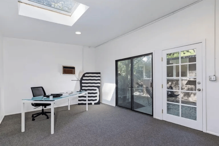 In the garage-turned-ADU, the sofa, desk, and storage are all one with the architecture. The designers even sectioned off a corner with a wood-paneled cabinet, envisioning someone might put a mini fridge inside it one day. “The hope is that there’s a buyer who appreciates what we’re doing and is willing to pay a bit more for stuff that’s thoughtfully designed,” says Jacoby.