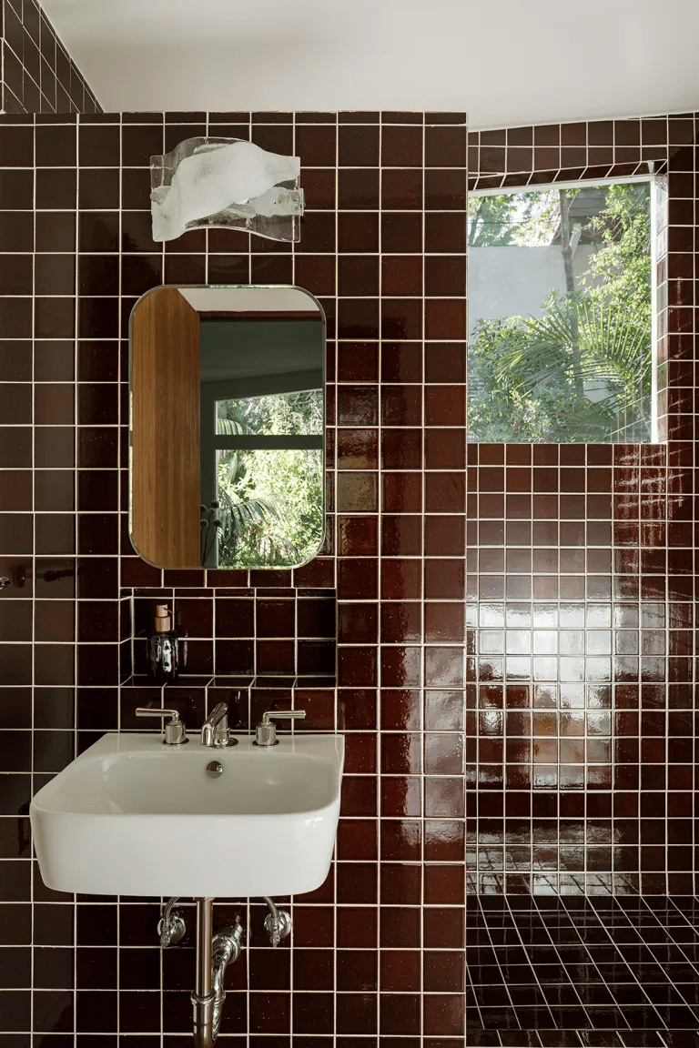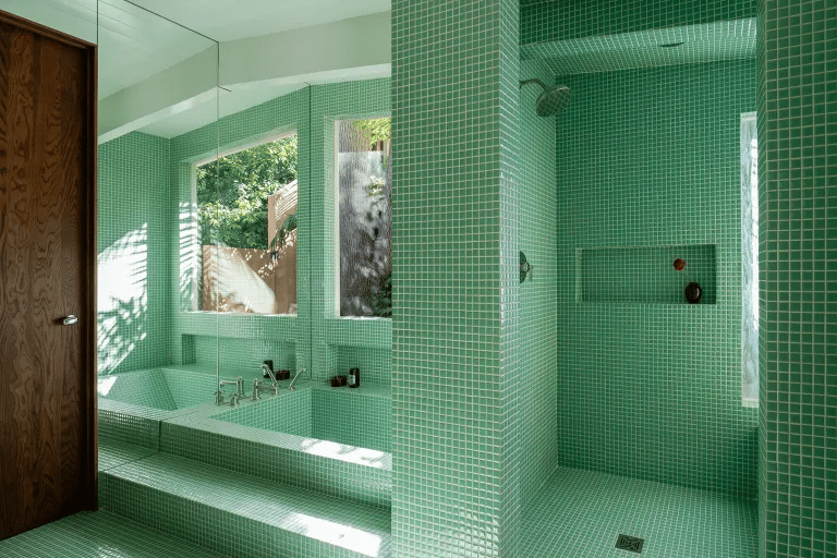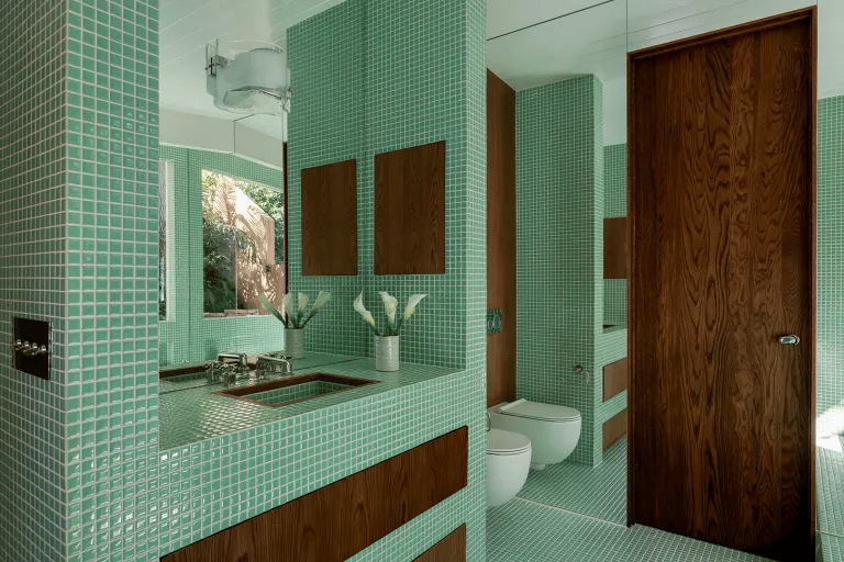 Riffing off old midcentury homes they’ve seen with floor-to-ceiling tile, Jacoby and Cohan swathed almost every inch of the bathrooms in the house in monochromatic square tiles: 5x5s in chocolate brown in a guest bath, 1x1s in mint green in the primary. Both are from a go-to vendor in Japan.