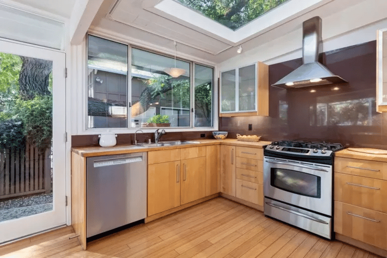 The designers simplified the choppy kitchen layout by creating a single entry point into the room. In part, they wanted to take the kitchen back to the days when the cooking zone (and the inevitable mess) was separate from the rest of the home. Still, to make the space feel prime for entertaining in 2025, they carved out open shelves in the wall adjacent to the living room.