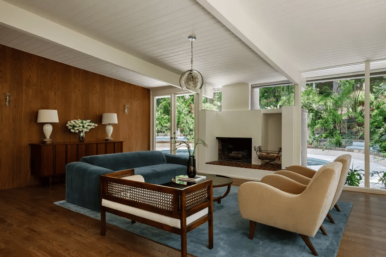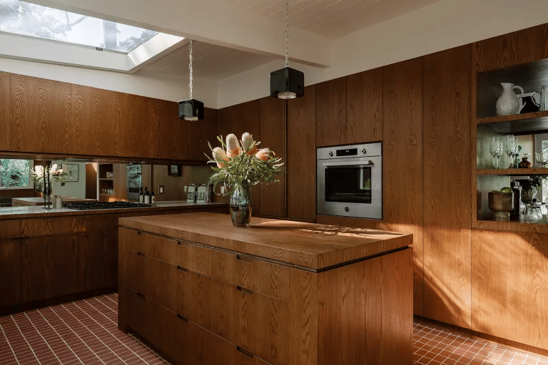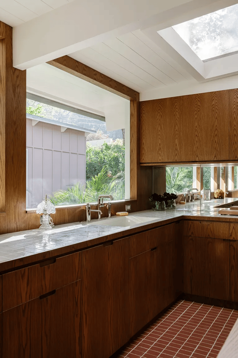 One surefire way to bring a mid-century house back to its roots? Rich wood paneling. Jacoby whipped up a custom stain for the white oak walls throughout the property. Meanwhile, Cohan hunted down midcentury door knobs by Italian architect and furniture designer Luigi Caccia Dominioni at auctions. “Each one is a little work of art in itself,” she says.