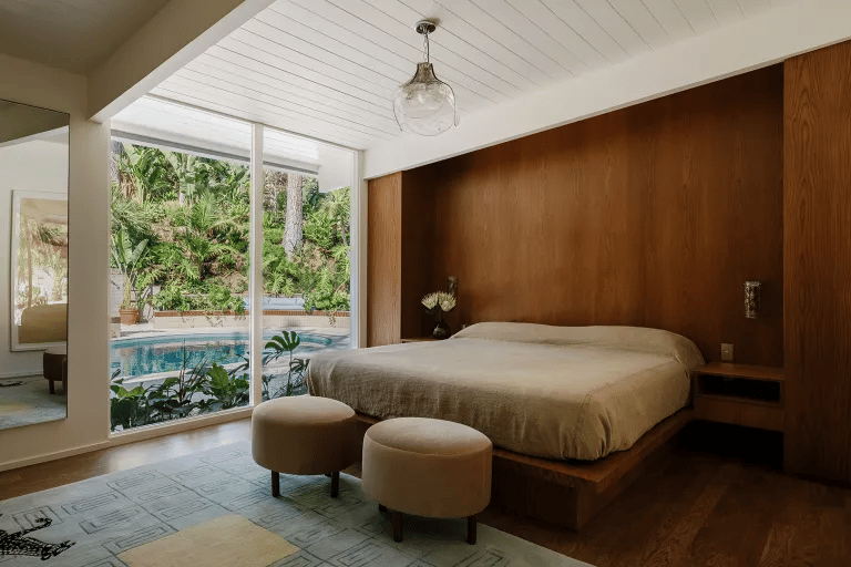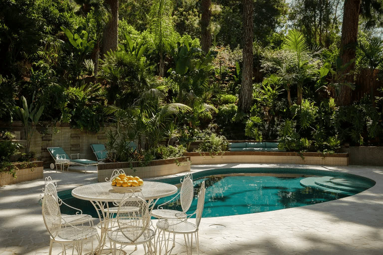 The backyard got the biggest transformation by way of a kidney-shaped pool and a masonry wall that completely secludes the lot. At the same time, Jacoby and Cohan wanted to honor the original landscape, which was designed by Garrett Eckbo in the 1960s (he’s the one who added the massive pine trees out back). They peppered more tall greenery around the pool, which also acts as a shady shield around the sun loungers. “We wanted it to feel like you were in Costa Rica,” says Cohan. Even the outdoors transports you to another time—and place.