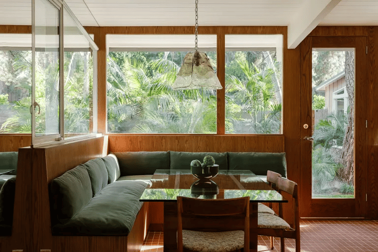 The banquette, however, is the real connection point between the two spaces. With its overstuffed cushions covered in silky soft mohair from Scalamandré and large windows overlooking the lush yard, the spot is easily the best seat in the house.