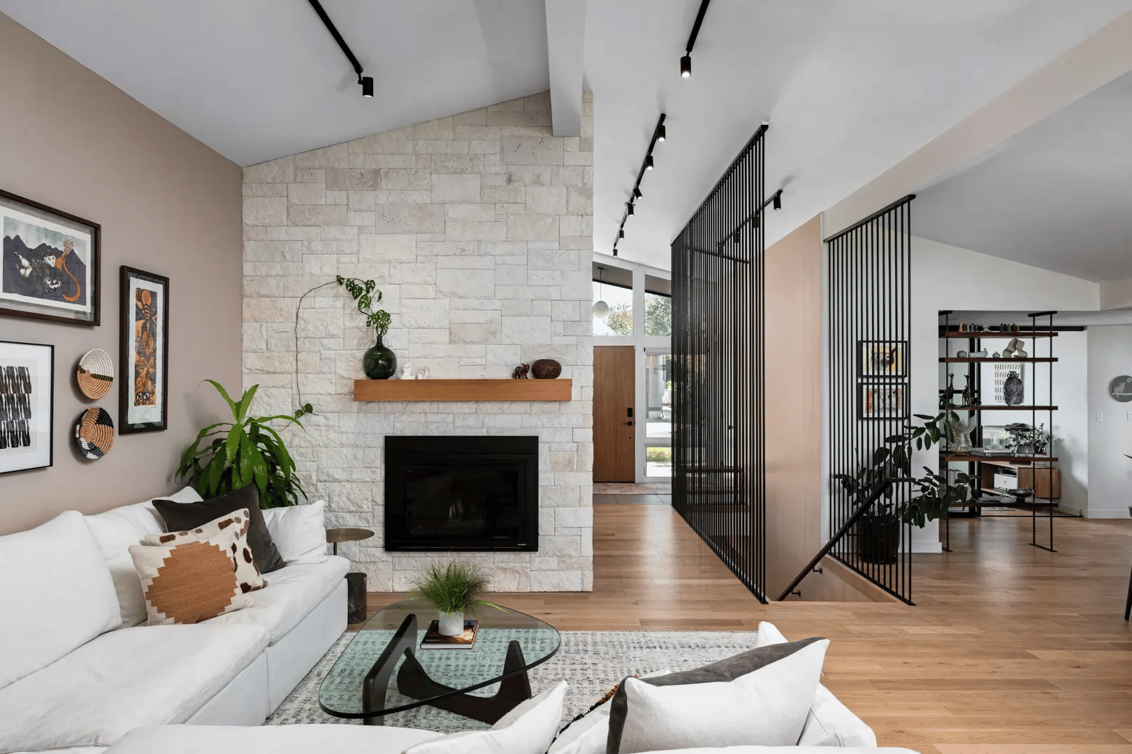 The design also makes room for the family’s art collection, assembled through years of travel. Walls and niches were arranged to accommodate artwork, allowing the pieces to become part of the architecture rather than decoration added afterward. The home begins to reflect the lives of its occupants as much as its mid-century origins.
