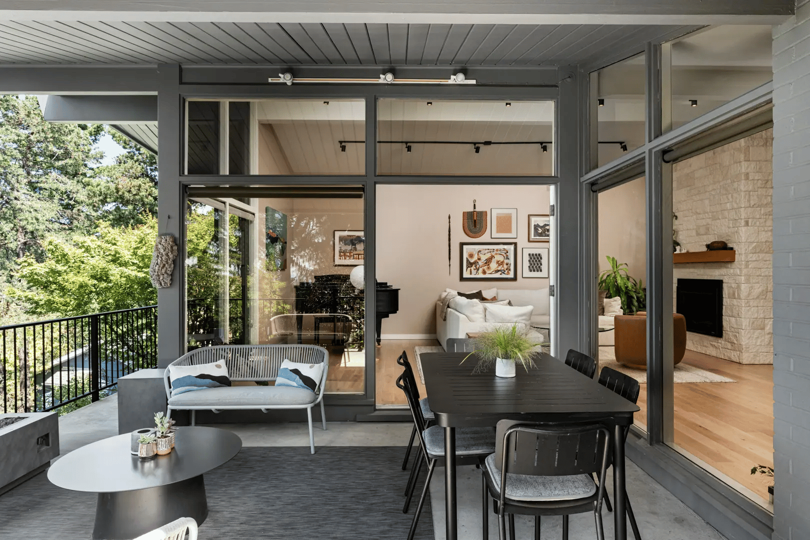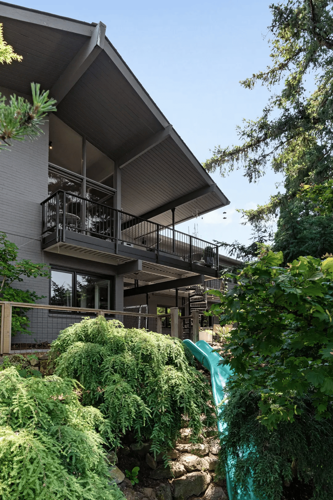 At the back of the house, the steep site becomes an advantage. Expanded deck areas and larger windows take full advantage of the panoramic Portland views. Outdoor space feels closely tied to the interiors, extending daily life toward the landscape.