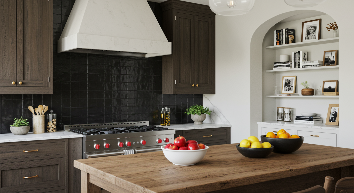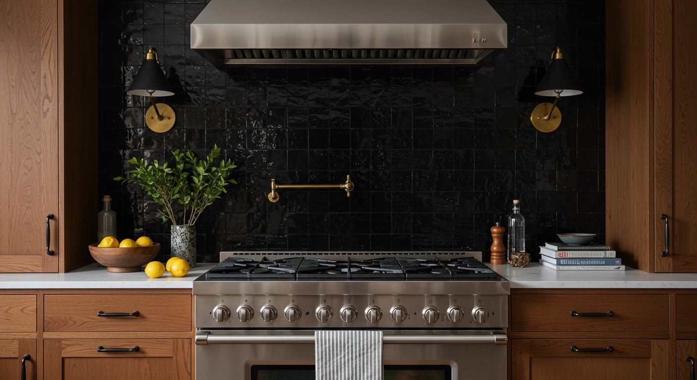 Riffing on the black zellige backsplash, they chose a fusion quartzite countertop—a natural, durable stone that made Twiehaus and her client gasp when they saw it at the stone yard. The matte terracotta floor tile helps diffuse all the glimmer coming from the cooktop zone.