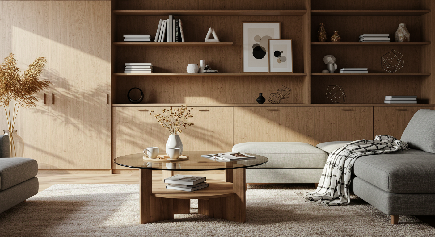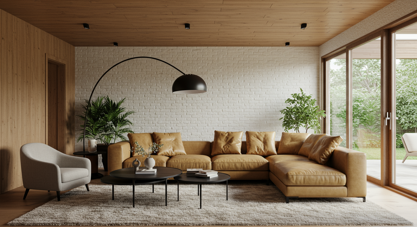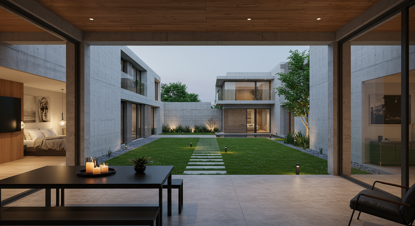Exterior materials are brought interior as you enter the home. This light-filled double-height space contains the living, kitchen, dining, and bar area. Full height sliding glass doors frame views to the inner courtyard. Through an opening in the brick wall, a family room and guest suite reveal a more intimate scale of the project.
