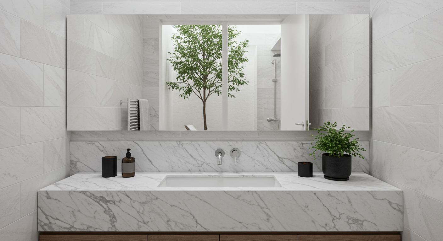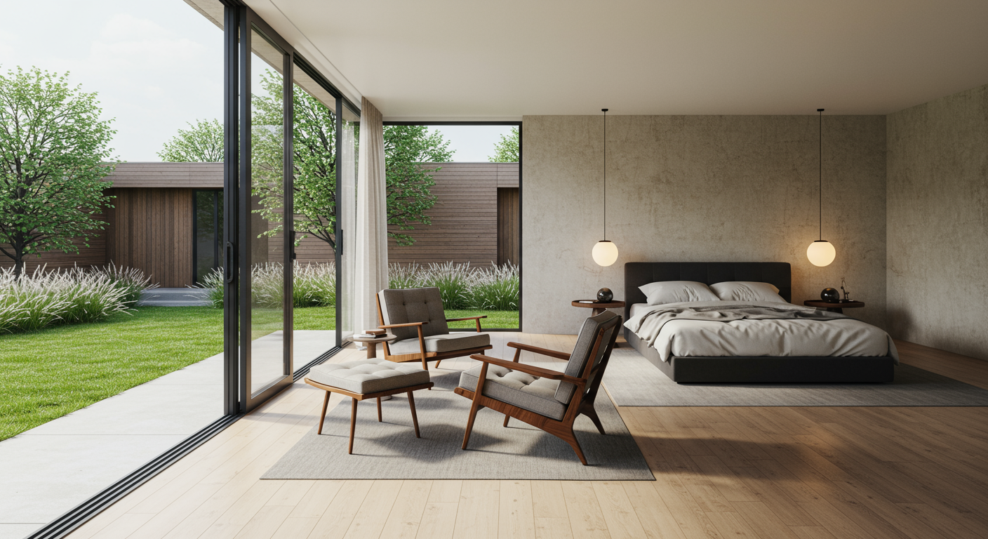 Across the courtyard from the family room, the primary suite mirrors this intimacy and expands on it with its own central courtyard space. A single maple tree anchors the suite, as bath, closet and bedroom encircle it.