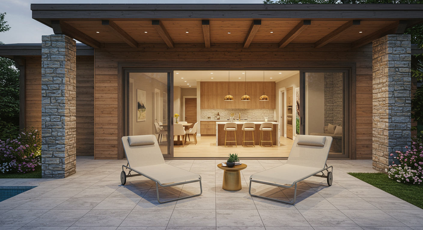 The home's moving glass walls are protected by large overhangs that extend slightly over balconies. These balconies shelter the patio below, which has a large TV that swings down into the outdoor area, essentially creating an indoor-outdoor media room.